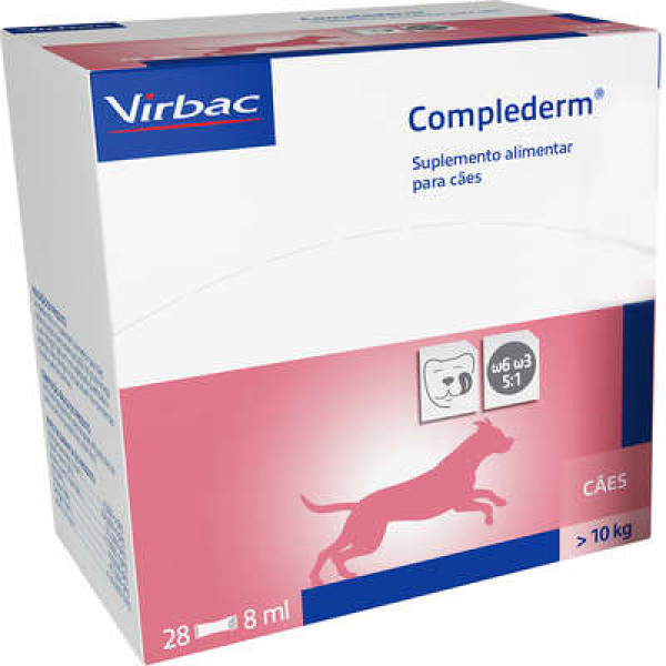 O Suplemento Alimentar para Cães e Gatos Complederm Virbac contém vitaminas e ácidos graxos essenciais, os ácidos graxos essenciais são componentes fundamentais da dieta que desempenham importantes funções estruturais e metabólicas, não sendo sintetizados no organismo, é um suplemento alimentar nutricional que atua na manutenção do pelo e pele dos animais, com ômega 3 e ômega 6, estando ambos envolvidos na formação da barreira protetora da pele e na modulação da inflamação.