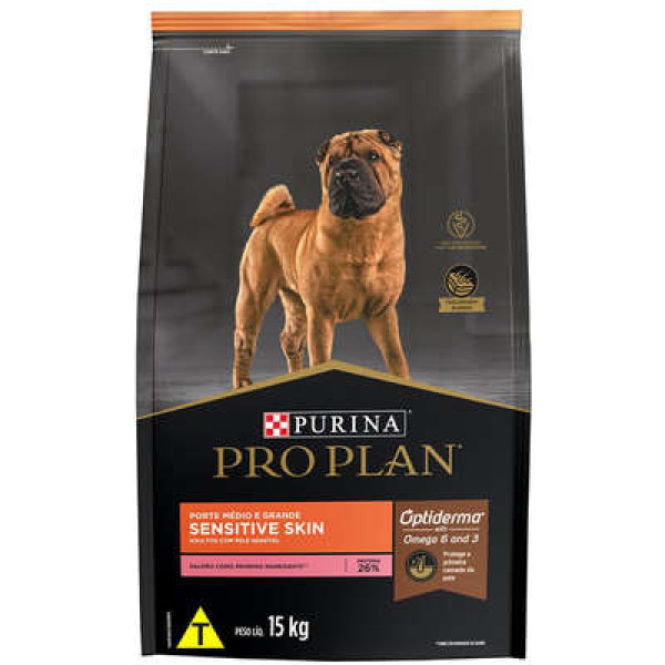 A Pro Plan Sensitive Skin é indicado para cães adultos, não contém corantes artificiais. também é formulada com carne de salmão, é uma ótima fonte de proteína para cães mais sensíveis. Também tem um nível otimizado de ácidos graxos ômega 3 e 6, vitaminas, antioxidantes, cobre e selênio, que reforçam a proteção da pele e promovem uma pelagem mais flexível e brilhante.