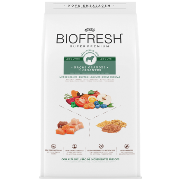 Biofresh Super Premium é inovador e diferente porque possui alta inclusão de ingredientes frescos, diretamente da natureza. O resultado é um alimento completo e equilibrado que se destaca por elevar a nutrição dos cães de raças grandes e gigantes ao seu mais alto patamar. A TECNOLOGIA Biofresh garante a preservação deste alimento de forma segura e 100% natural, SEM ADIÇÃO DE CONSERVANTES ARTIFICIAIS.