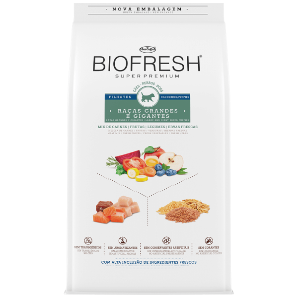 Biofresh Super Premium é inovador e diferente porque possui ALTA INCLUSÃO DE INGREDIENTES REALMENTE FRESCOS, diretamente da natureza. O resultado é um alimento completo e equilibrado que se destaca por elevar a nutrição dos filhotes de raças grandes e gigantes ao seu mais alto patamar. A TECNOLOGIA Biofresh garante a preservação deste alimento de forma segura e 100% natural, SEM ADIÇÃO DE CONSERVANTES ARTIFICIAIS.