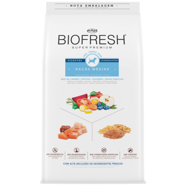 Biofresh Super Premium é inovador e diferente porque possui ALTA INCLUSÃO DE INGREDIENTES REALMENTE FRESCOS, diretamente da natureza. O resultado é um alimento completo e equilibrado que se destaca por elevar a nutrição dos filhotes de raças médias ao seu mais alto patamar. A TECNOLOGIA BIOFRESH garante a preservação deste alimento de forma segura e 100% natural, SEM ADIÇÃO DE CONSERVANTES ARTIFICIAIS.