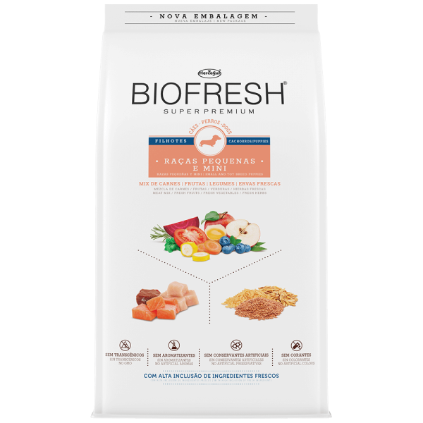Biofresh Super Premium é inovador e diferente porque possui alta inclusão de ingredientes realmente frescos, diretamente da natureza. O resultado é um alimento completo e equilibrado que se destaca por elevar a nutrição dos filhotes de raças pequenas e mini ao seu mais alto patamar. A tecnologia Biofresh garante a preservação deste alimento de forma segura e 100% natural, sem adição de conservantes artificiais.