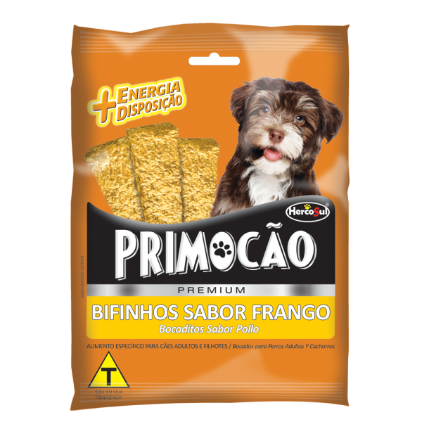 Primocão BIFINHOS sabor FRANGO é um petisco macio, com um sabor irresistível, indicado para cães de todas as idades. Sua receita contém mais de 80% de carne de frango, uma proteína altamente nutritiva e deliciosa. Primocão BIFINHOS é um carinho especial para o seu amigo!