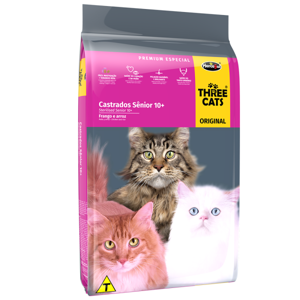 Three Cats Original Castrados Sênior 10+ é um alimento moderno e seguro, livre de corantes e aromatizantes artificiais, formulado para atender todas as necessidades de gatos castrados com mais de 10 anos de idade. Sua fórmula, rica em antioxidantes, é ideal para manter gatos ativos e com saúde. Ingredientes selecionados atuam na manutenção da saúde do trato urinário, da visão e do coração, além de manter a pelagem macia e brilhante.
