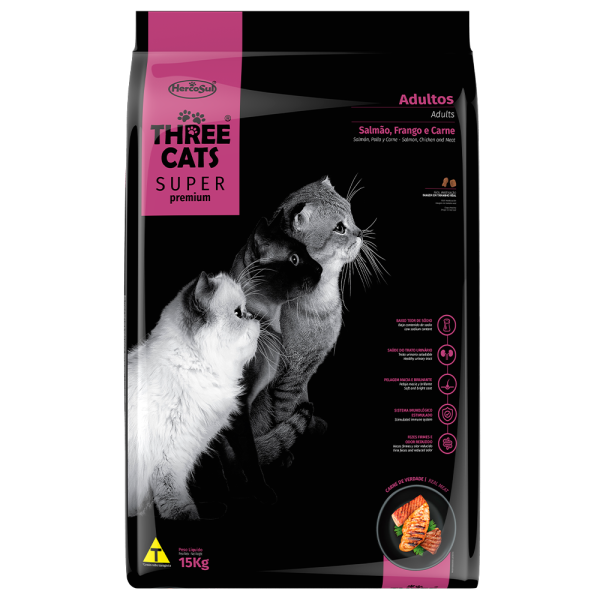 Three Cats Super Premium Adultos Sabor Salmão, Frango e Carne é um alimento rico em ingredientes nobres e de alta qualidade, tais como carnes frescas de frango, peixe e bovina, que fornecem todos os nutrientes necessários de forma equilibrada, do jeito que seu gato precisa para ter uma excelente qualidade de vida.