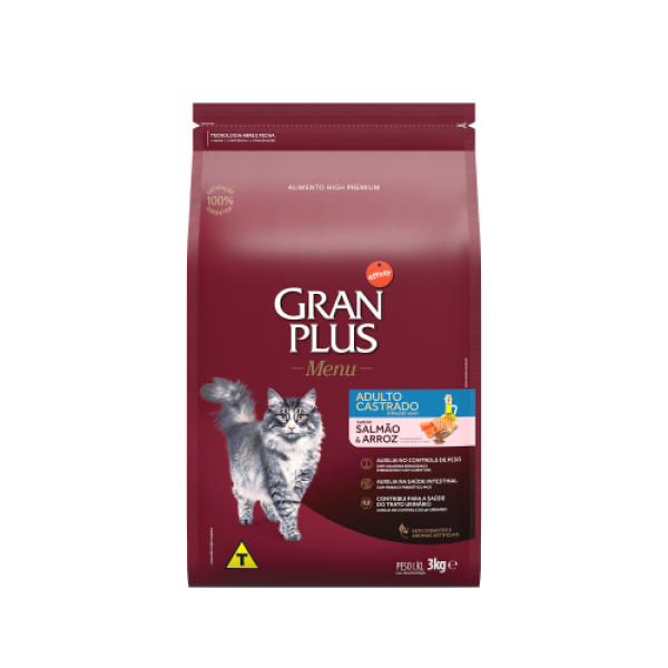 Ração Gran Plus Para Gatos Adultos Castrados Sabor Salmão 3 KG