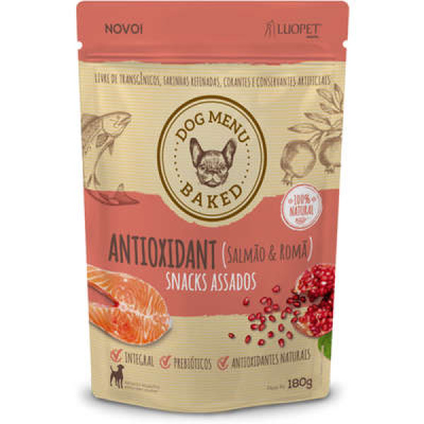 O Snack Luopet Dog Menu Baked Antioxidante, é um delicioso snack, totalmente desenvolvido para a nutrição e auxilio a saúde do seu pet. Possuí antioxidantes naturais, vitaminas, ômega 3 e flavonóides de romã.