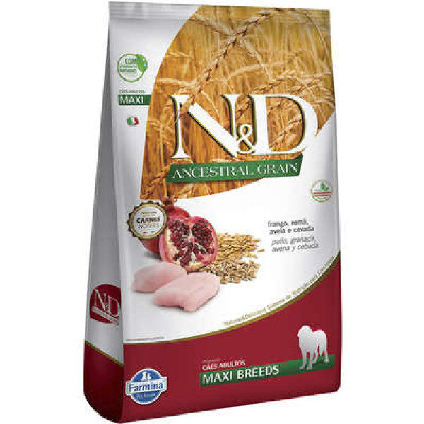 A Ração Farmina N&D Ancestral Grain Frango Cães Adultos Raças Grandes é um alimento de origem Italiana, com baixo índice glicêmico, possui apenas cereais ancestrais em pequena quantidade, que resulta em um produto com nível de amido reduzido, por isso promove menor oscilação da resposta glicêmica. Conservado naturalmente, utilização da Vitamina E (concentrado de tocoferóis) como conservante natural, livre de BHA e BHT. Possui 90% de ingredientes de origem animal e livre de transgênico