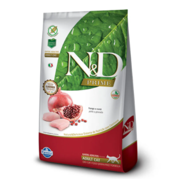 A Ração Farmina N&D Prime Frango e Romã Gatos Adultos é uma receita italiana, elaborada com carnes de frango de altíssima qualidade, conservantes naturais, livre de cereais, portanto não contém ingredientes transgênico