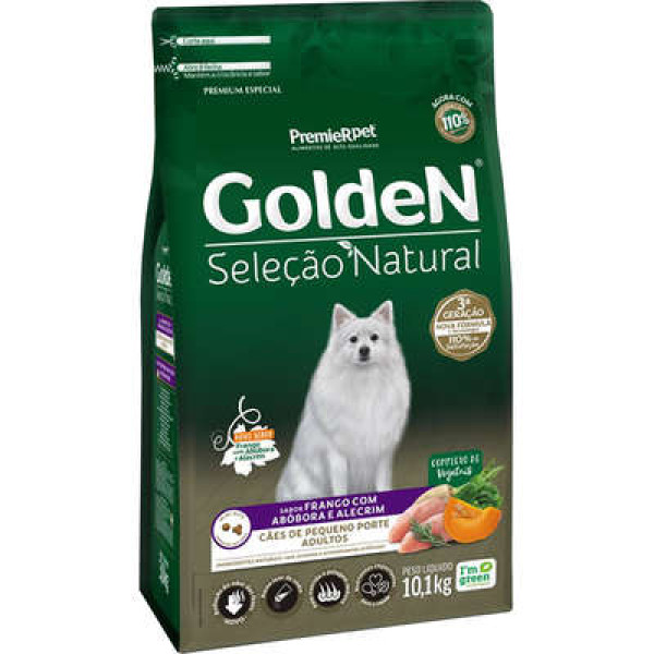A Ração Seca PremieR Pet Golden Seleção Natural Frango, Abóbora e Alecrim para Cães Adultos Raças Pequenas contém nutrientes importantes para a saúde (ingredientes ricos em carotenoides, fibras e minerais), baixo teor de sódio para ressaltar o sabor natural dos ingredientes, sem corantes e aromatizantes artificiais e sem ingredientes transgênicos.
