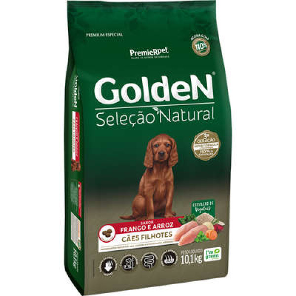 A Ração Seca PremieR Pet Golden Seleção Natural para Cães Filhotes Contém complexo de 6 vegetais, como fonte de fibras e sais minerais, baixo teor de sódio para ressaltar o sabor natural dos ingredientes, sem corantes e aromatizantes artificiais e sem ingredientes transgênicos.