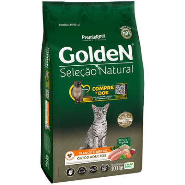 A Ração Seca PremieR Pet Golden Seleção Natural para Gatos Adultos contém complexo de 6 vegetais, como fonte de fibras e sais minerais, baixo teor de sódio para ressaltar o sabor natural dos ingredientes, sem corantes e aromatizantes artificiais e sem ingredientes transgênicos