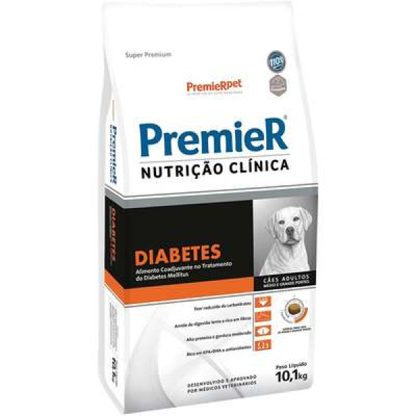 PremieR Nutrição Clínica Cães Diabetes é um alimento auxiliar ao tratamento da diabetes mellitus em cães adultos de portes médio ou grande.