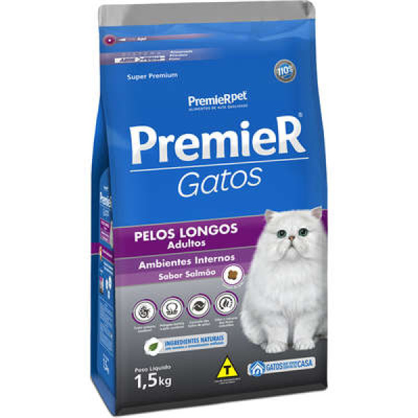 Ração Premier Ambientes Internos Para Gatos Adultos De Pelos Longos Sabor Salmão 1,5 KG
