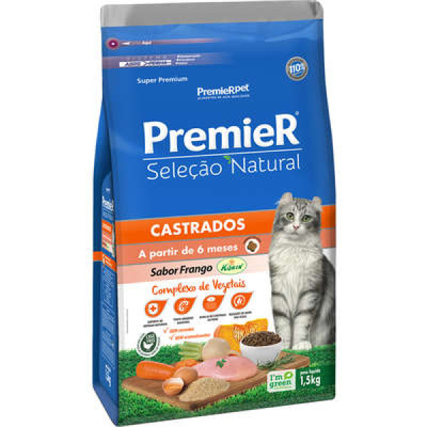 Ração Premier Seleção Natural Para Gatos Adultos Castrados Sabor Frango 1,5 KG