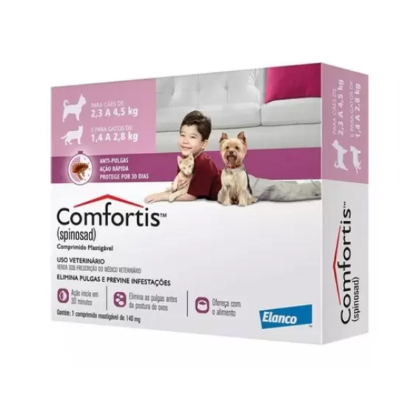 Comfortis antipulgas em comprimido é o único antipulgas via oral para gatos. Comfortis tem como princípio ativo o Spinosad, ele é muito seguro e age em 30 minutos após a ingestão do comprimido. Spinosad causa morte das pulgas causando hiperexcitação do parasita, paralisia e morta da pulga. Em cães, Comfortis elimina 100% das pulgas em 4 horas. Em gatos, Comfortis elimina 100% da pulgas em 24 horas. VANTAGENS DO COMFORTIS ANTIPULGAS PARA CÃES E GATOS - Uma única dose protege por 30 dias - Não sai nos banhos, portanto sua ação dura 30 dias mesmo - Palatável, sua apresentação é em forma de comprimido mastigável sabor carne - Não há risco de intoxicação por lambedura como acontece nos antipulgas de uso tópico - Quando utilizado por 3 meses seguidos, elimina até as pulgas do ambiente. Sua ação é tao rápida que dificulta que a pulga adulta bote ovos que contaminam o ambiente nas infestações por pulgas - Auxilia no controle de alergias causadas pela picada de pulgas. RECOMENDAÇÕES PARA O USO DO COMFORTIS ANTIPULGAS - Comfortis deve ser administrado junto com o alimento ou logo após as refeições. - Pode ser dado para cães e gatos com idade superior a 14 semanas - Seguro para gatos a partir de 1,4 kg de peso - Seguro para cães a partir de 2,3 kg de peso - Dê o comprimido por via oral com a dosagem recomendada para cada faixa de peso: Spinosad 140 mg: cães com peso entre 2,3 a 4,5 kg e gatos com peso entre 1,4 a 2,8 kg Spinosad 270 mg: cães com peso entre 2,3 a 4,5 kg e gatos com peso entre 1,4 a 2,8 kg Spinosad 560 mg: cães com peso entre 9 a 18 kg e gatos com peso de 5,4 a 11 kg Spinosad 810 mg: somente para cães com peso entre 18 a 27 kg Pode causar vômito em alguns gatos.