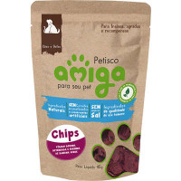 Petisco Amiga Chips Fígado Bovino Cães e Gatos contêm em sua composição batata doce, que é rica em fibras por isso ajuda a manter o intestino regulado e fortalece o sistema imunológico; beterraba que é fonte de antioxidantes e possui propriedades anti-inflamatórias e farinha de banana verde. A banana verde é uma fonte de amido resistente, um nutriente que funciona como fibra prebiótica no intestino, contribuindo com a saciedade, saúde intestinal e imunidade.