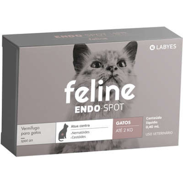 Feline Endospot, antiparasitário interno de aplicação spot-on. Sua fórmula, altamente eficaz, elimina os parasitas internos que frequentemente afetam os gatos. A Ivermectina, lactona macrocíclicas exerce potente efeito contra nematódeos e ácaros da sarna. O Praziquantel, derivado sintético da isoquinolina-pirazina apresenta efeito contra trematódeos e cestódeos.