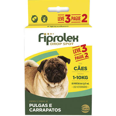 O Antipulgas e Carrapatos Ceva Fiprolex Drop Spot de 0,67 mL para Cães até 10 Kg possui um rápido efeito letal nas formas adultas dos ectoparasitos e por meio de efeito residual, é capaz de manter os cães livres de pulgas por até 28 dias e cães livres de carrapatos por até 21 dias após a aplicação.