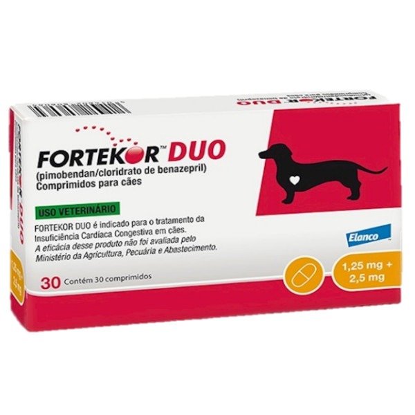 O intervalo de dose recomendado é de 0,25 – 0,5mg/kg de Pimobendan e 0,5 – 1 mg/kg de Cloridrato de benazepril dividido em duas doses diárias, com intervalo de 12 horas, aproximadamente 1 hora antes da alimentação. Dar Pimobendan com uma refeição completa pode interferir na sua absorção, razão pela qual o Fortekor™ DUO deve ser administrado 1 hora antes da alimentação.