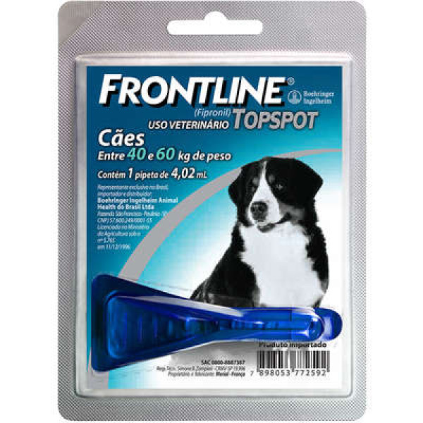 Frontline TopSpot Cães 1 a 10 kg/10 a 20 kg/20 a 40kg/40 a 60kg: ideal para os cães caseiros, que vivem em ambientes com baixo risco de infestação. Fabricado pela Boehringer Ingelheim, empresa que tem como principal objetivo desenvolver soluções para melhorar cada vez mais a vida de cada pet, Frontline TopSpot Cães é um dos produtos da família Frontline, desenvolvido para proporcionar melhor saúde e bem-estar aos cães.