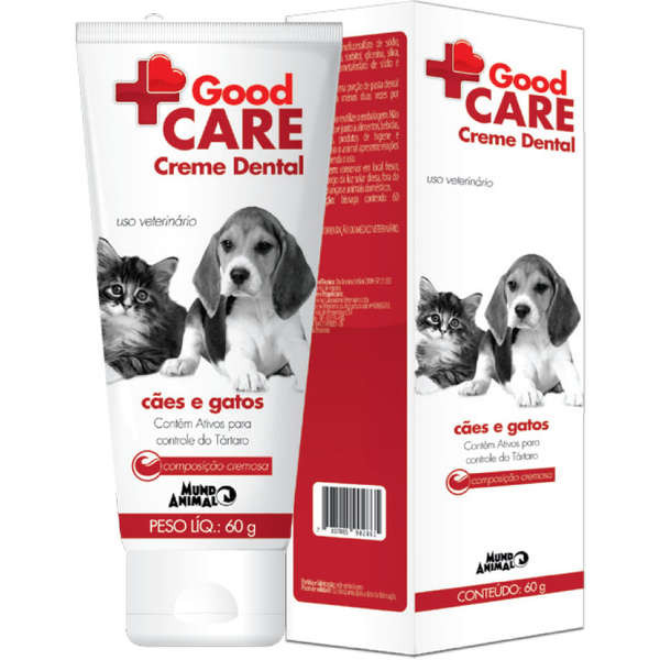 Creme Dental Mundo animal Good Care atua na limpeza e higienização dos dentes de cães e gatos e auxilia na redução do mau hálito. Sabor tutti-frutti.