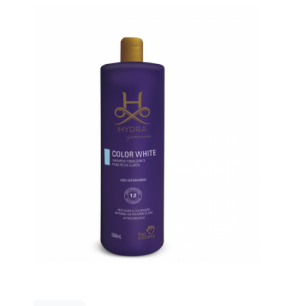 Hydra Groomers Color White Shampoo 500mL Contém pigmentos cosméticos de efeito temporário que realçam a cor natural das pelagens claras. Não age como tintura.