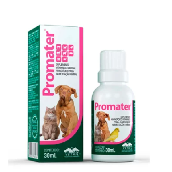 Suplemento Vitamínico Promater é perfeita e equilibrada, pois reúne os nutrientes responsáveis para auxiliar no desempenho reprodutivo de machos e fêmeas de todas as espécies de animais domésticos.