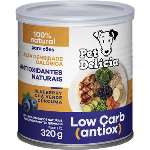 A Ração Úmida Pet Delícia Low Carb Antiox Natural é um alimento elaborada por especialistas para cães que necessitam uma dieta de baixo carboidratos em fase de tratamento, manutenção ou recuperação. A fórmula foi desenvolvida com peito de frango, cortes selecionados de carne e legumes frescos. Além das vitaminas e minerais balanceadas, enriquecemos essa receita com blueberry que tem efeito antioxidante e ingredientes funcionais como azeite de oliva (gorduras saudáveis, ômegas 6 e 9, e ação anti-inflamatória), aveia (fibras, prebióticos e beta-glucanos), algas (ômega 3 e ação anti-inflamatória), cúrcuma (anti-inflamatória), maçã (prebióticos e ação anti-inflamatória), chá verde (antioxidante e anti-inflamatória), óleo de coco (gorduras saudáveis triglicérides de cadeia média TCM), e linhaça (fibras, ômega 3 e ação anti-inflamatória). Uma ração saborosa e cheirosa, que tem uma ótima aceitação pelos doguinhos sensibilizados.