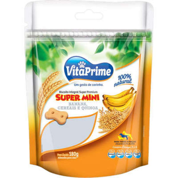 O Biscoito Integral VitaPrime Super Premium Super Mini Banana, Cereais e Quinoa para Cães é 100% natural, sem corantes, aromatizantes e açúcar, com níveis nutricionais apropriados e ingredientes naturais de alta qualidade que permitem auxiliar no cuidado e saúde do seu pet. Uma ótima opção para mimar, adestrar e até para complementar a alimentação.