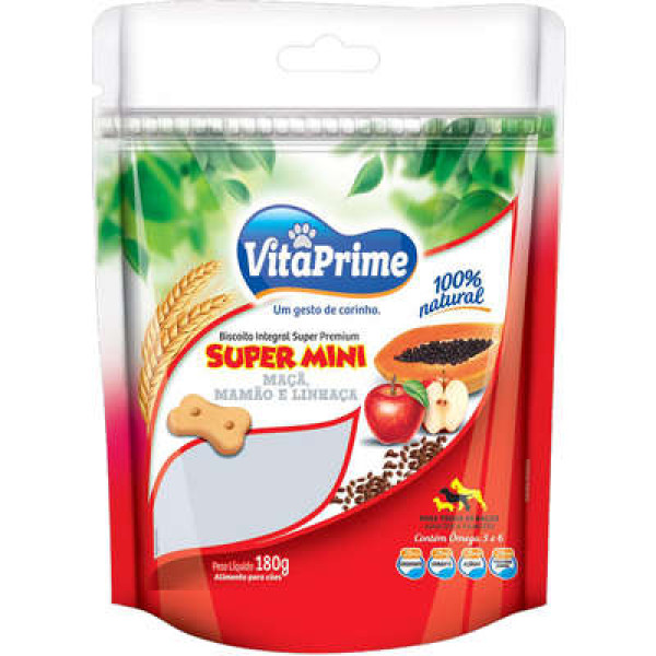 O Biscoito Integral VitaPrime Super Premium Super Mini Maça, Mamão e Linhaça para Cães é 100% natural, sem corantes, aromatizantes e açúcar, com níveis nutricionais apropriados e ingredientes naturais de alta qualidade que permitem auxiliar no cuidado e saúde do seu pet. Uma ótima opção para mimar, adestrar e até para complementar a alimentação.