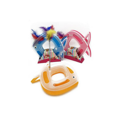 Possui um compartimento interno para guardar petiscos e sua forma faz com que seja desafiador para o gato conseguir retirá-los de dentro do brinquedo, podendo ainda ajustar essa dificuldade girando o gatinho pendurado que serve como um controle da vazão dos petiscos.
