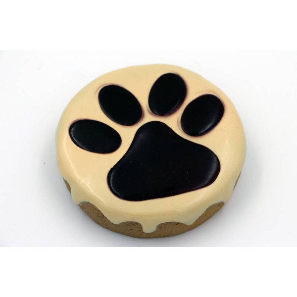 Dog bolinho patinha, fabricado em vinil e se assemelha ao delicioso bolo com calda de chocolate. Com dimensão 11x11x2,5 cm pesando 75g.