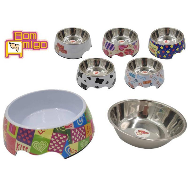 Comedouro melanina, composto por duas partes que se soltam para facilitar a higienização, a parte externa é feita em melanina e está disponível em 4 estampas diferentes, enquanto a parte interna é feita de inox. Capacidade para 400 ml, pesando 330g e medindo 18x7 cm.