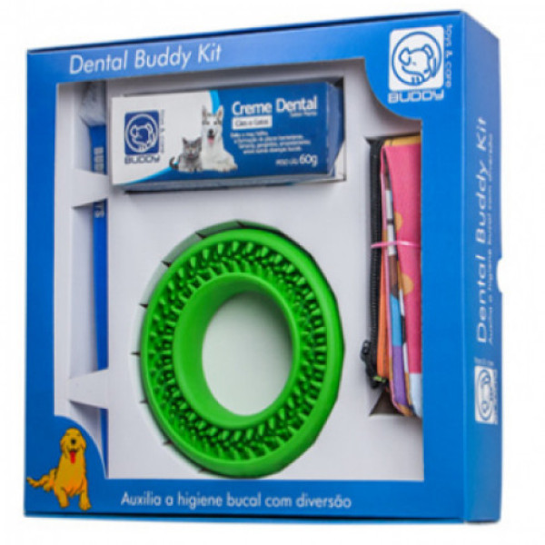 Para que a limpeza seja mais completa, neste Kit, além do Dental Buddy você recebe de brinde um Creme Dental Buddy, uma escova de dentes e uma necessaire para guardar seu Kit. O Dental Buddy é um acessório para auxiliar na higiene bucal dos cachorros. Portanto, desenvolvemos esse produto para facilitar de forma interessante e interativa, com a maior eficiência possível.