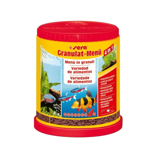 O sera menu granulados é o alimento base composto por 4 diferentes alimentos granulados, cuidadosamente processados, que se podem distribuir separadamente, para todos os peixes do aquário comunitário que comem principalmente na zona média da água.