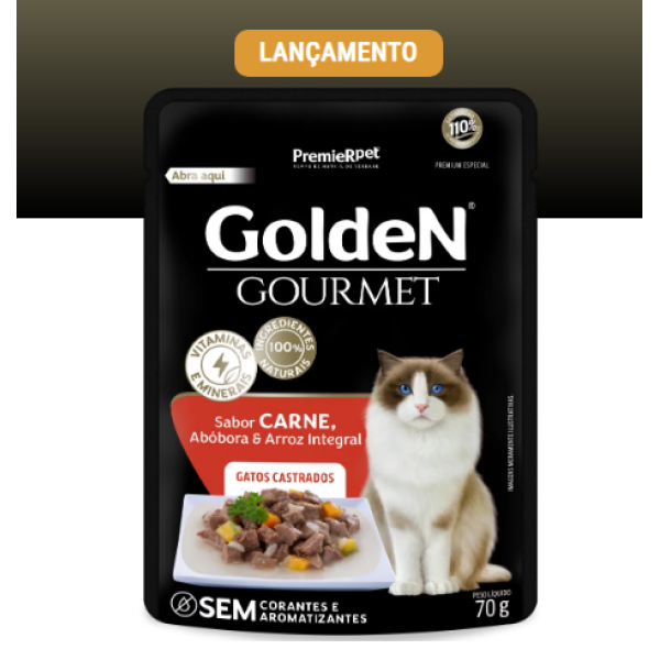 GoldeN Gourmet Gatos Castrados Sabor Carne, Abóbora e Arroz Integral é um alimento Premium Especial que faz parte da linha GoldeN Gourmet. Este produto é um alimento úmido completo indicado para gatos castrados a partir dos 6 meses idade, pois é enriquecido com L-carnitina, vitaminas e minerais, possibilitando um equilíbrio de nutrientes para o gato castrado.