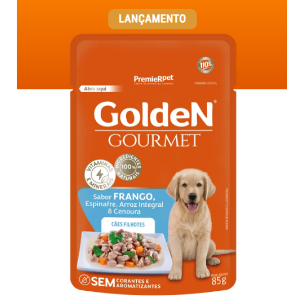 Ração Úmida Golden Gourmet Para Cães Filhotes Sabor Frango, Espinafre, Arroz Integral e Cenoura 85g