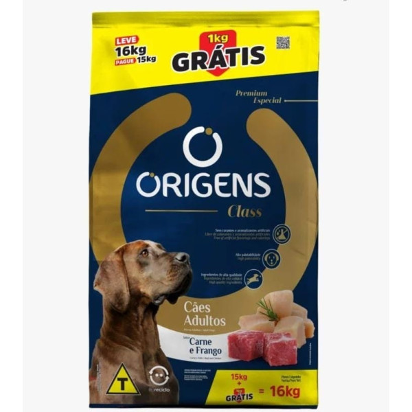 Ração Origens Class Para Cães Adultos De Porte Médio e Grande Sabor Carne e Frango 15+1 Kg Gratis