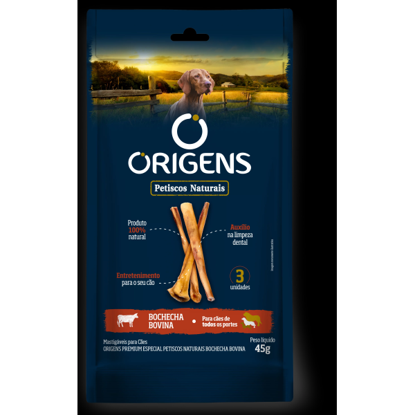 Origens Petiscos Naturais é uma linha de produtos mastigáveis que tem como objetivo oferecer momentos que relembram a origem ancestral dos cães. A linha conta com 10 produtos 100% naturais, que utilizam apenas coprodutos bovinos desidratados como ingredientes, e não possuem aditivos, conservantes ou palatabilizantes. Origens Petiscos Naturais contribui para aliviar o estresse do cão, estimulando comportamentos naturais como morder e roer e também auxilia para a limpeza dental.