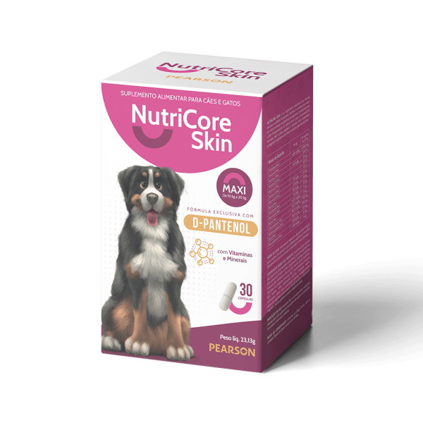 NutriCore Skin atua na derme e pelos de cães e gatos, fortalecendo e diminuindo a queda de pelos dos animais. Contém em sua formulação D-pantenol, biotina, vitamina A, C e E, zinco e silício.