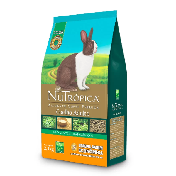 NuTrópica® Coelho Adulto é um alimento extrusado completo, cientificamente formulado e especialmente desenvolvido para coelhos a partir dos 9 meses de idade. Cada embalagem de NuTrópica® Coelho Adulto contém uma combinação exclusiva das mais nobres e saborosas matérias-primas não transgênicas, preparadas sob rigoroso controle de qualidade e utiliza as melhores técnicas em produção de alimentos. São mais de 30 ingredientes diferentes, incluindo alfafa e vários tipos de grãos integrais como aveia, ervilha, linhaça e trigo, que juntos proporcionam os níveis ideais dos nutrientes necessários para a perfeita saúde, beleza, bem-estar e vitalidade do seu coelho. Por ser um alimento não transgênico, NuTrópica® Coelho Adulto não utiliza milho nem soja em sua formulação.