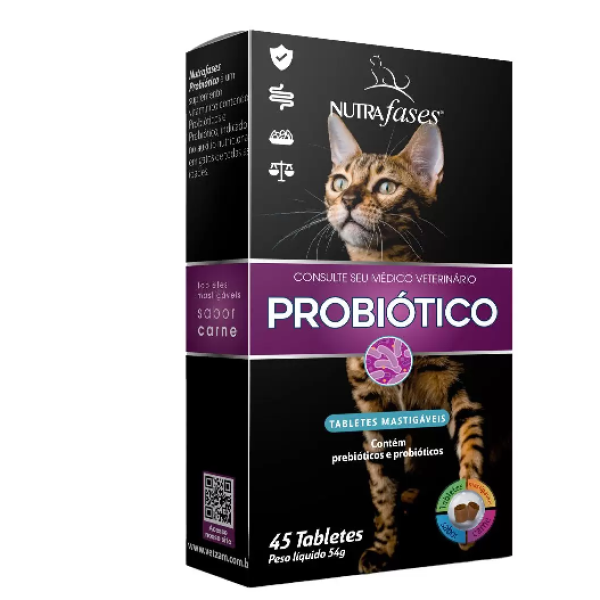 O Suplemento Probiótico Nutrafases, apresentado em uma embalagem contendo 45 tabletes específicos para gatos, é uma solução formulada para promover o equilíbrio saudável da flora intestinal dos felinos.