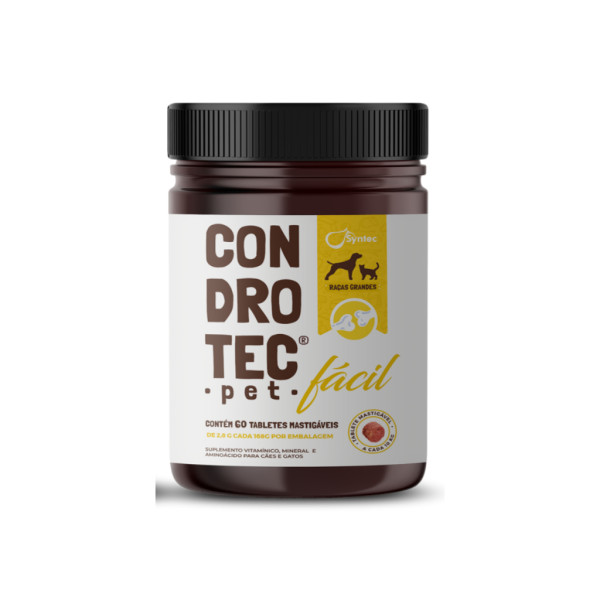 CONDROTEC PET FÁCIL é um suplemento alimentar palatável à base de Condroitina A, Glucosamina, Vitamina C e Zinco. Indicado para cães e gatos de todos os portes e fases da vida para aporte dos nutrientes compostos na formulação.