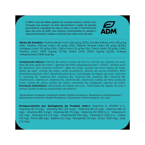Alimento completo para cães adultos. Manter em lugar seco e ventilado. Uso proibido na alimentação de ruminantes. Não destinado ao consumo humano. Podem ocorrer variações no tamanho e cor das partículas no processo produtivo. Máxima sarisfação comparado com o produto da fórmila anterior.