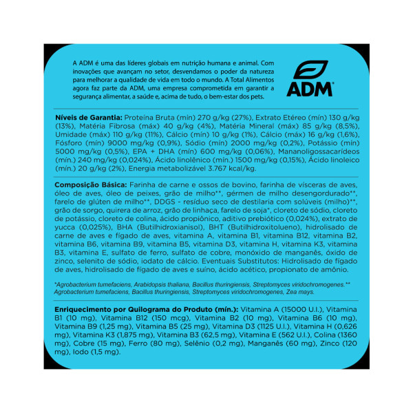Proteína Bruta (mín) 270 g/kg (27%), Extrato Etéreo (mín) 130 g/kg (13%), Matéria Fibrosa (máx) 40 g/kg (4%), Matéria Mineral (máx) 85 g/kg (8,5%), Umidade (máx) 110 g/kg (11%), Cálcio (mín) 10 g/kg (1%), Cálcio (máx) 16 g/kg (1,6%), Fósforo (mín) 9000 mg/kg (0,9%), Sódio (mín) 2000 mg/kg (0,2%), Potassio (mín) 5000 mg/kg (0,5%), EPA + DHA (mín) 600 mg/kg (0,06%), Mananoligossacarídeos (mín.) 240 mg/kg (0,024%), Ácido linolênico (mín.) 1500 mg/kg (0,15%), Ácido linoleico (mín.) 20 g/kg (2%), Energia metabolizável 3.767 kcal/kg.