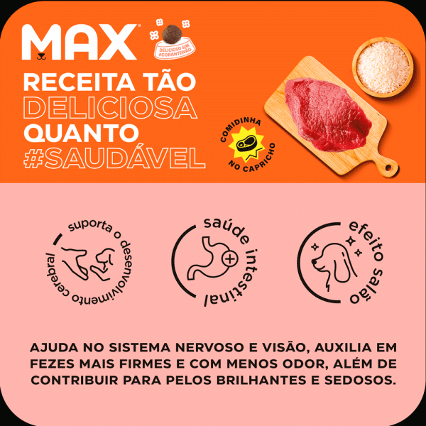 Com um blend de ingredientes selecionados para promover maior benefício, a Ração Max para Filhotes favorece o bom funcionamento do intestino e diminuição do odor das fezes. Além disso suporta o desenvolvimento cerebral e pele e pelagem mais bonita e saudável.