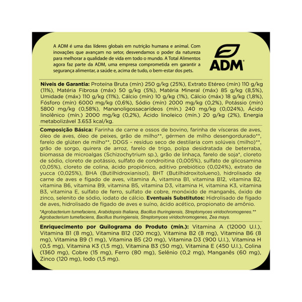 Proteína Bruta (mín) 250 g/kg (25%), Extrato Etéreo (mín) 110 g/kg (11%), Matéria Fibrosa (máx) 50 g/kg (5%), Matéria Mineral (máx) 85 g/kg (8,5%), Umidade (máx) 110 g/kg (11%), Cálcio (mín) 10 g/kg (1%), Cálcio (máx) 18 g/kg (1,8%), Fósforo (mín) 6000 mg/kg (0,6%), Sódio (mín) 2000 mg/kg (0,2%), Potassio (mín) 5800 mg/kg (0,58%), Mananoligossacarídeos (mín.) 240 mg/kg (0,024%), Ácido linolênico (mín.) 2000 mg/kg (0,2%), Ácido linoleico (mín.) 20 g/kg (2%), Energia metabolizável 3.653 kcal/kg.