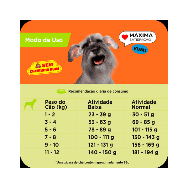 1. Consulte a sugestão de quantidade diária ideal para seu pet no verso das nossas embalagens. As porções podem variar de acordo com a idade, atividade e temperamento do seu cão.