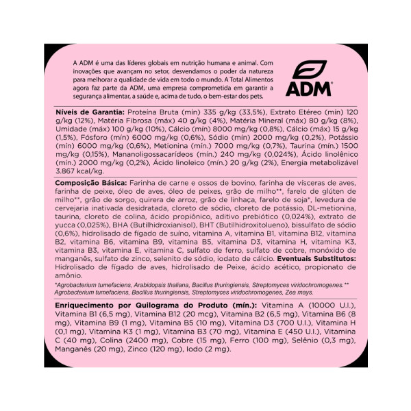 Proteína Bruta (mín) 335 g/kg (33,5%), Extrato Etéreo (mín) 120 g/kg (12%), Matéria Fibrosa (máx) 40 g/kg (4%), Matéria Mineral (máx) 80 g/kg (8%), Umidade (máx) 100 g/kg (10%), Cálcio (mín) 8000 mg/kg (0,8%), Cálcio (máx) 15 g/kg (1,5%), Fósforo (mín) 6000 mg/kg (0,6%), Sódio (mín) 2000 mg/kg (0,2%), Potássio (mín) 6000 mg/kg (0,6%), Metionina (mín.) 7000 mg/kg (0,7%), Taurina (mín.) 1500 mg/kg (0,15%), Mananoligossacarídeos (mín.) 240 mg/kg (0,024%), Ácido linolênico (mín.) 2000 mg/kg (0,2%), Ácido linoleico (mín.) 20 g/kg (2%), Energia metabolizável 3.867 kcal/kg.